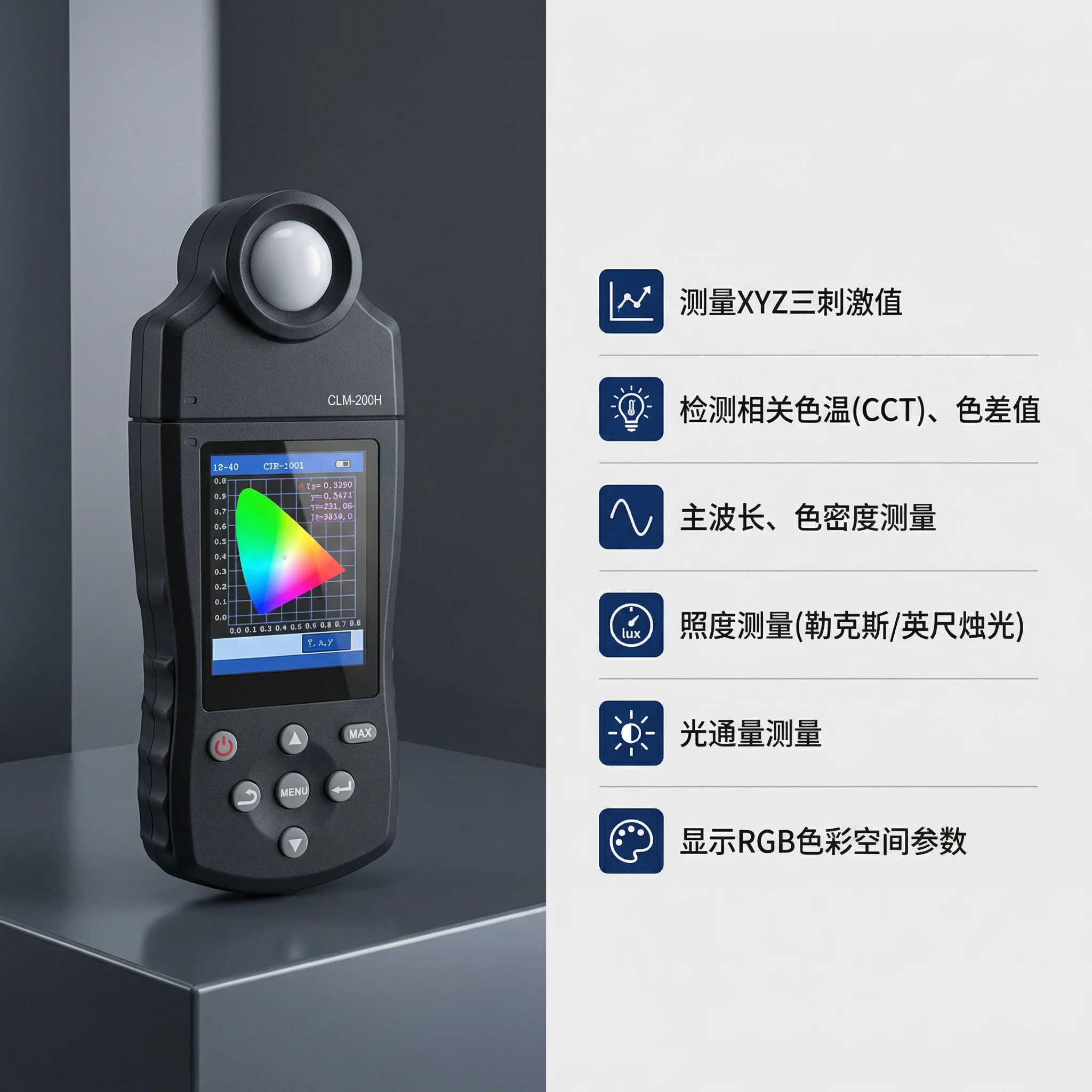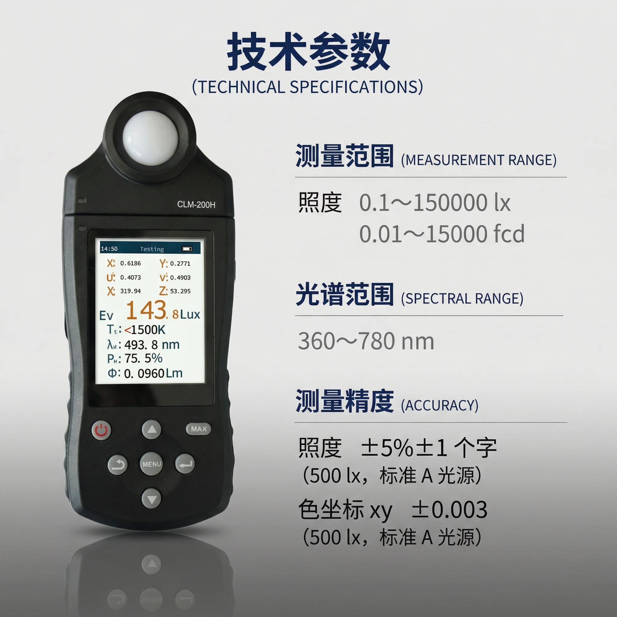 • 实验室级高精度:照度 ±5% 误差、色坐标 xy±0.003, 数据精准可信赖