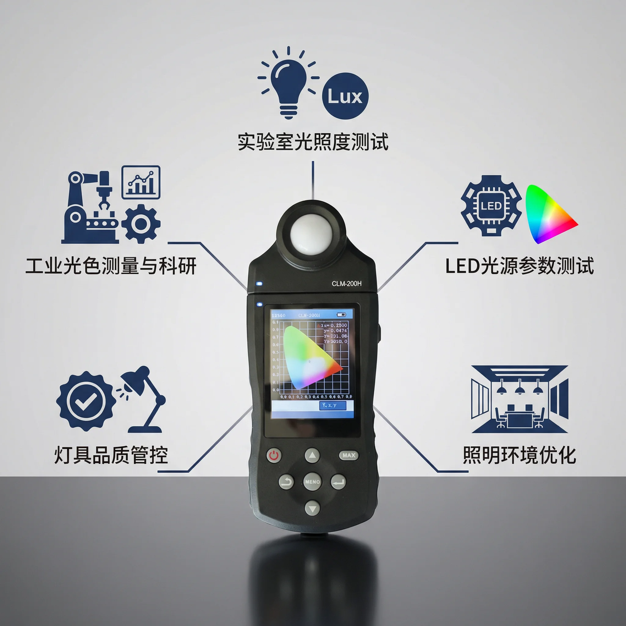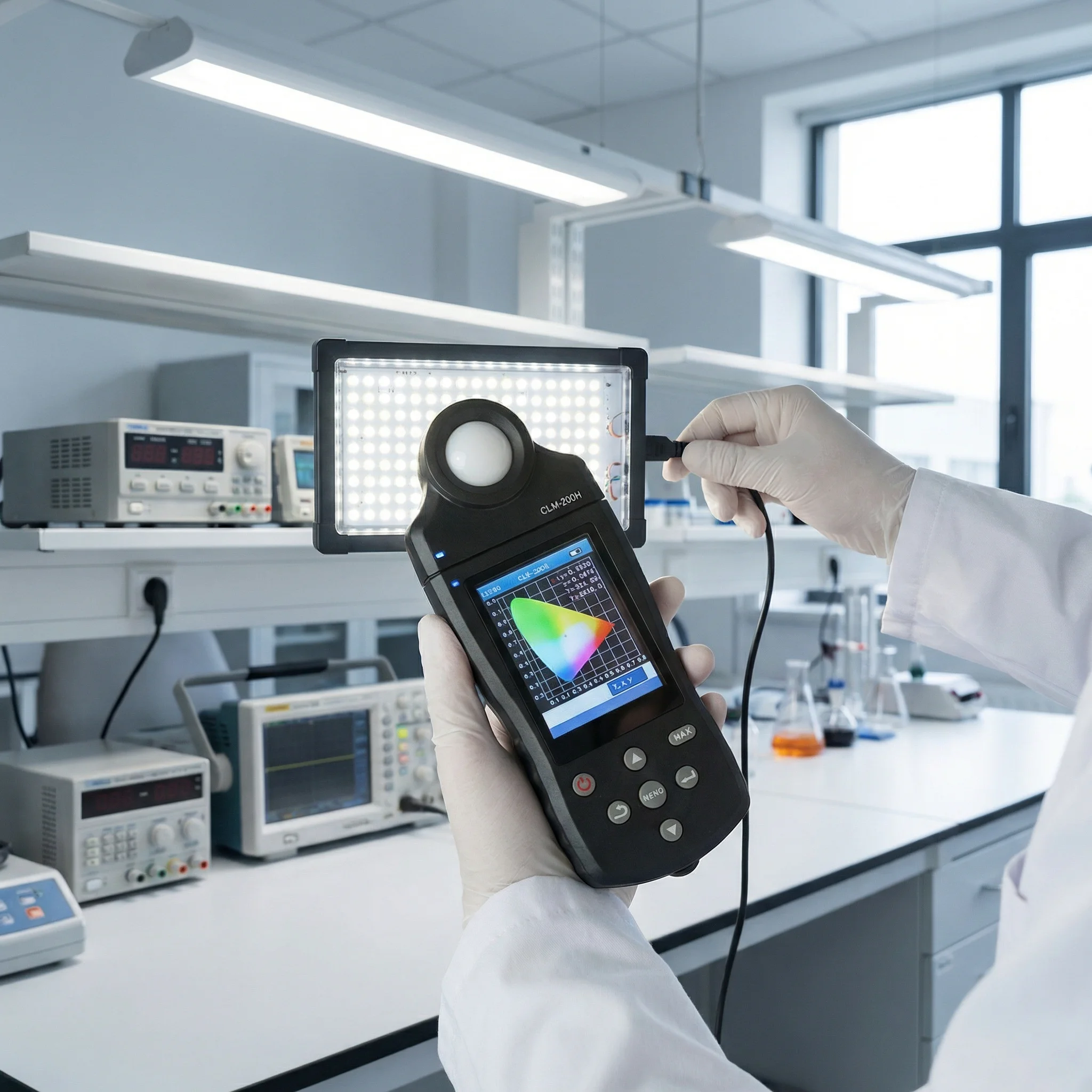 CLM-200H 是一款专业光测量仪器,可精准测定光照领域关键光度参数,包括三刺激值、色坐标、相关色温、主波长、照度、光通量等指标,支持数据存储与电脑软件分析,操作便捷、测量结果可重复,适用于各类照明设备的检测、分类与优化。