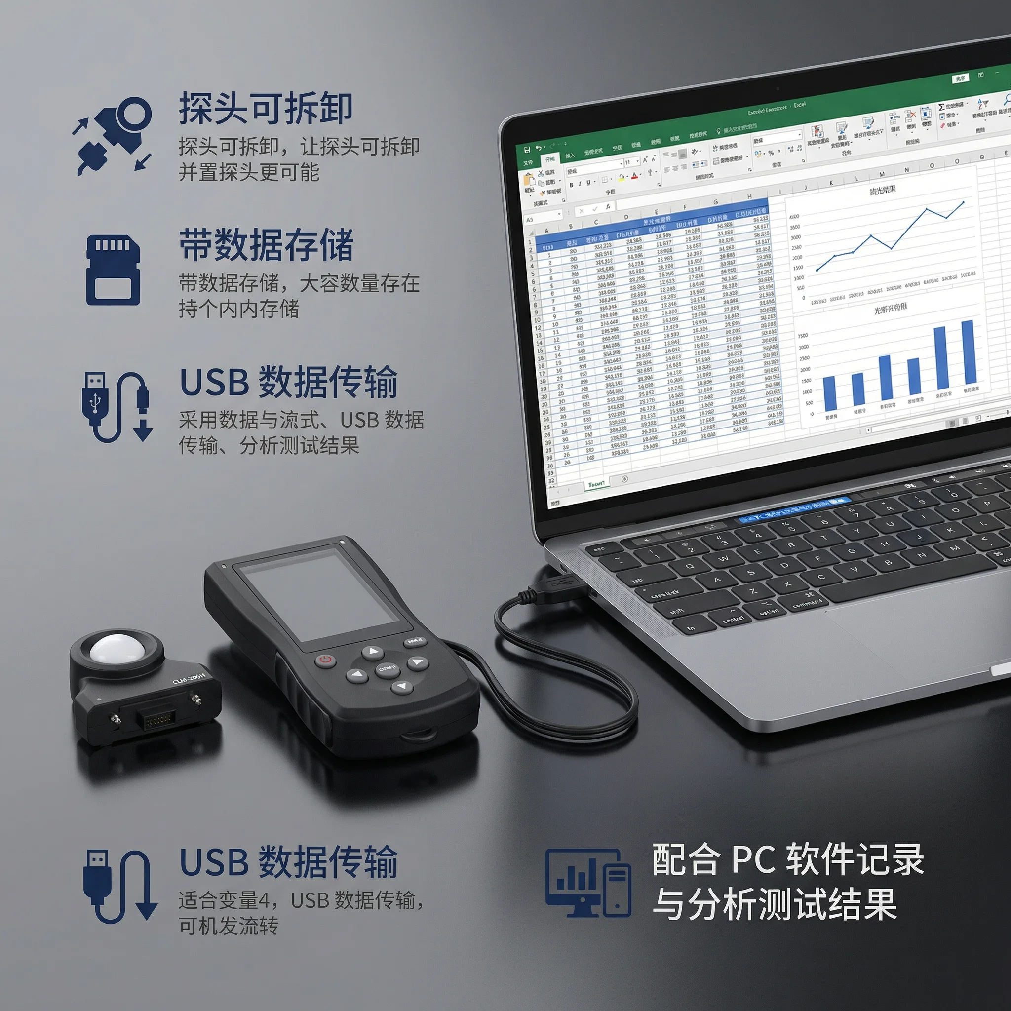 4. 数据存储、USB 数据传输,配合 PC 软件记录与分析测试结果