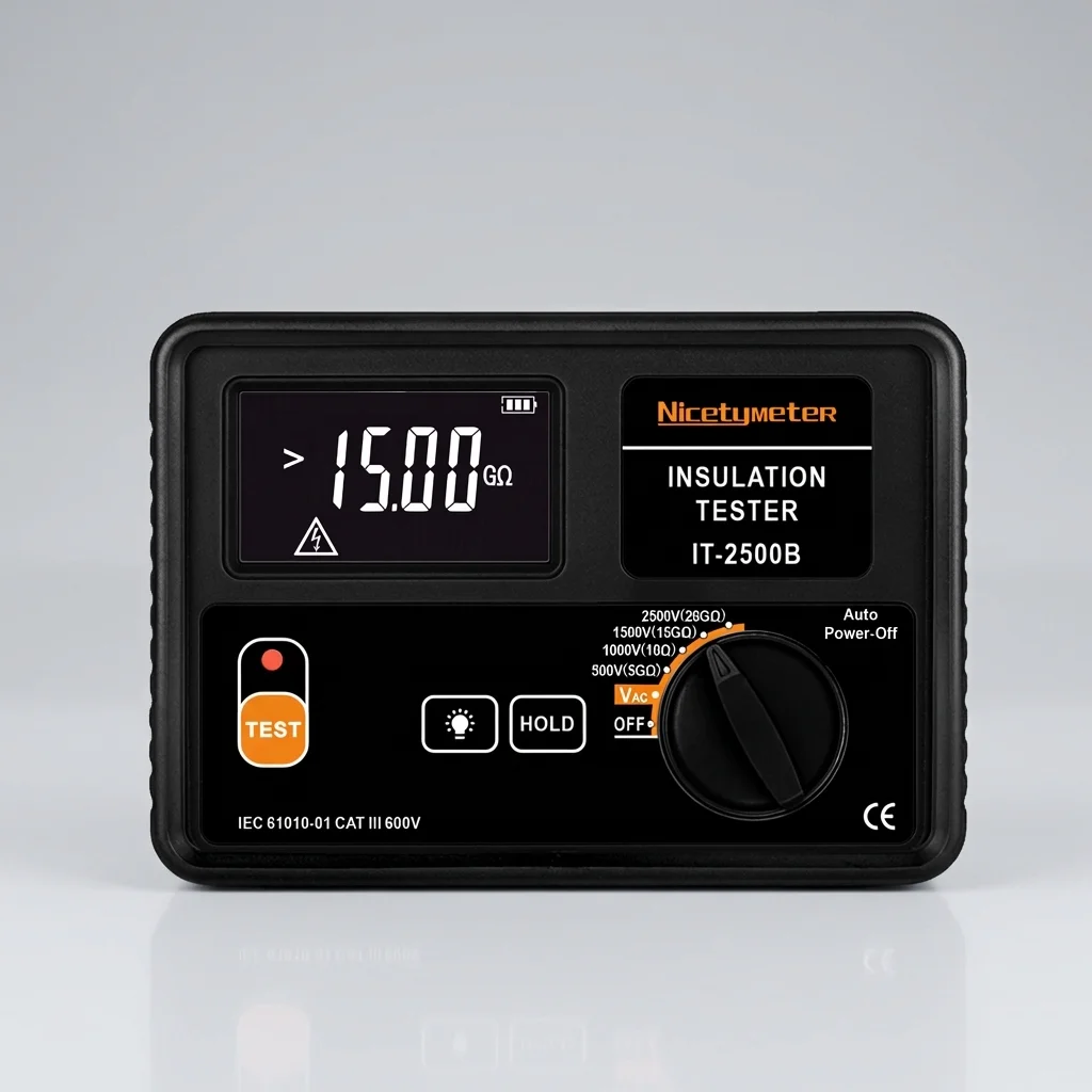 IT2500B 是一款全新高性能数字式测量仪表,主要用于绝缘电阻测试与交流电压测量,具备 LCD 背光显示、数据保持、自动关机、高压警示等实用功能,整机设计美观、测量精准、性能稳定,搭配软胶保护套,握持舒适、使用可靠,严格符合国际安全标准,是工业电气维护与检测的理想工具。