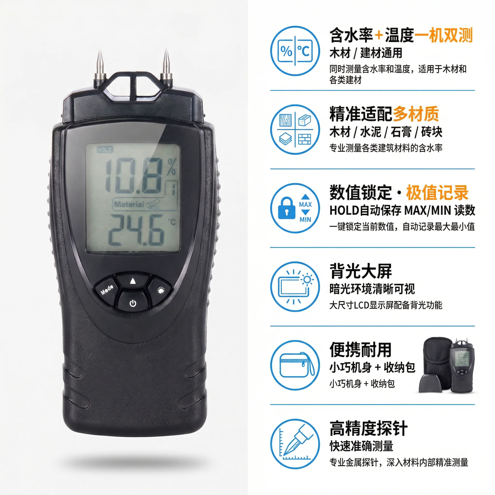 ST8040 是一款专业便携式双功能水分仪,采用电阻式测量原理,可精准检测木材与 7 类建筑材料含水率,同时测量环境温度,操作简单、读数快速,适合多场景含水率快速检测。